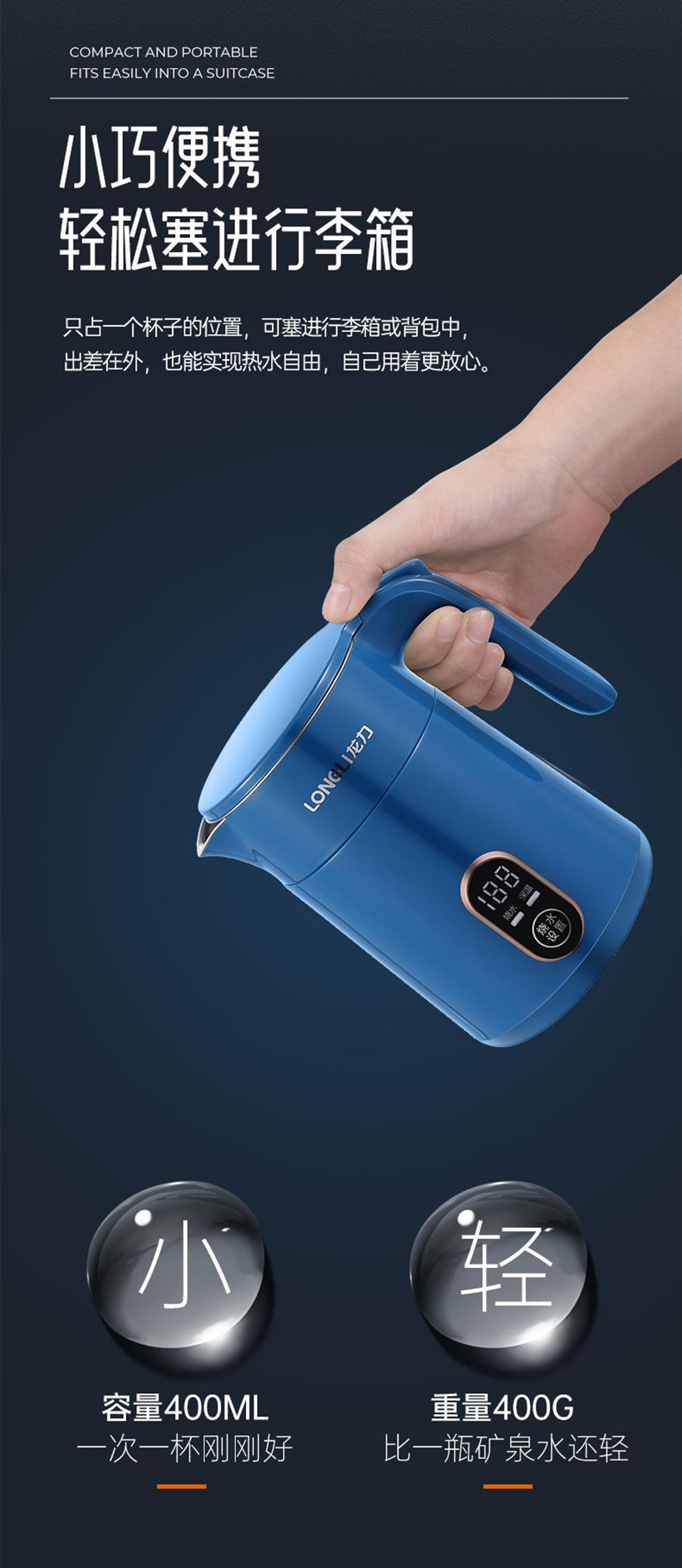 經常出遠門的朋友都知道,行李輕(qīng)小精簡才能讓旅(lǚ)途(tú)變得更輕鬆(sōng)!這款(kuǎn)便攜式旅行水壺隻占了一個杯子的位置,隨手塞進行李箱或背包中便可輕鬆出行(háng)。400ml的(de)容量,燒煮一次可暢飲一早(zǎo)上;杯子重(chóng)量僅400g,比礦泉水還要輕便。出門在(zài)外,一壺在手安心伴旅,時刻(kè)保持身(shēn)心(xīn)愉快(kuài)!