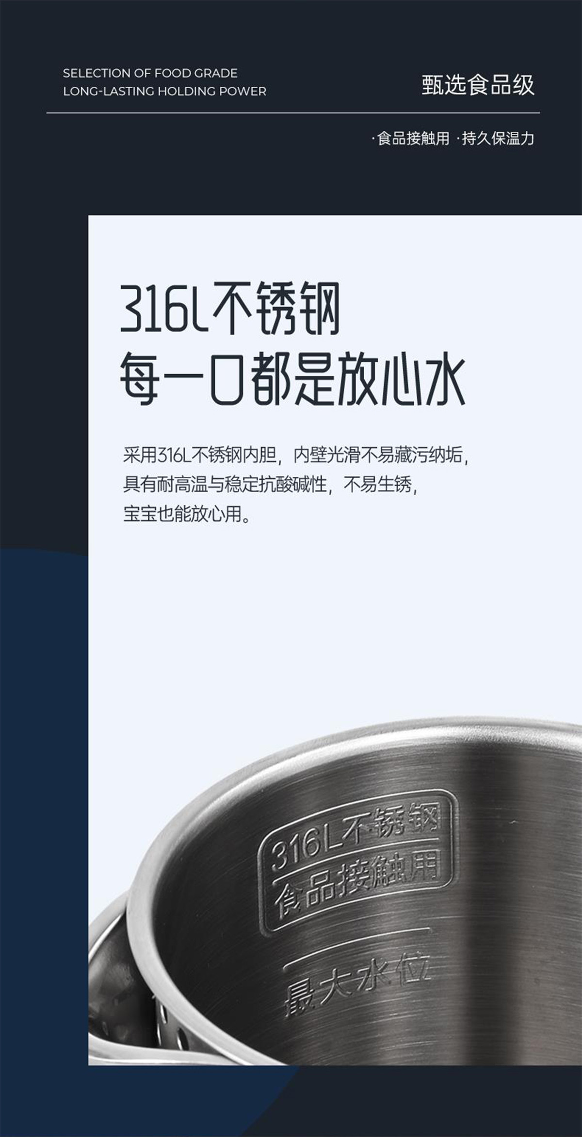 出遊暢飲一口放心水這款便攜式旅行水(shuǐ)壺采用316L不鏽(xiù)鋼內膽,一體成型無縫內膽,內壁光滑不易藏(cáng)汙納垢,便於清洗,煮出健康無異味水。內(nèi)膽是食品級不(bú)鏽鋼材質,具有耐高溫與穩定抗酸堿性,不易(yì)生鏽,寶寶(bǎo)也能放心用。