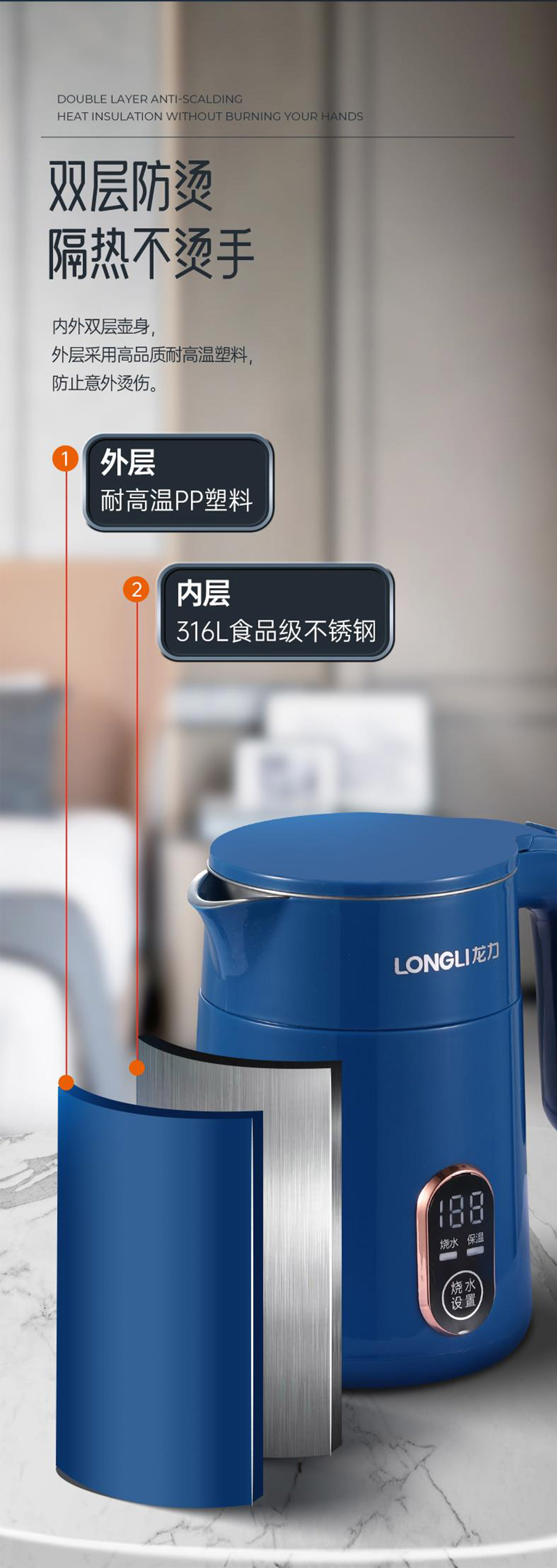 時刻嗬護您的雙(shuāng)手便攜式水壺雖然體積小,但該有的功能與安全保障不能少。這款水壺擁有內外雙層(céng)防燙壺身,外層采用耐高溫PP塑料,內層316L食品級不鏽(xiù)鋼,雙重保障,沸騰時不燙手,觸(chù)摸更安全(quán)。