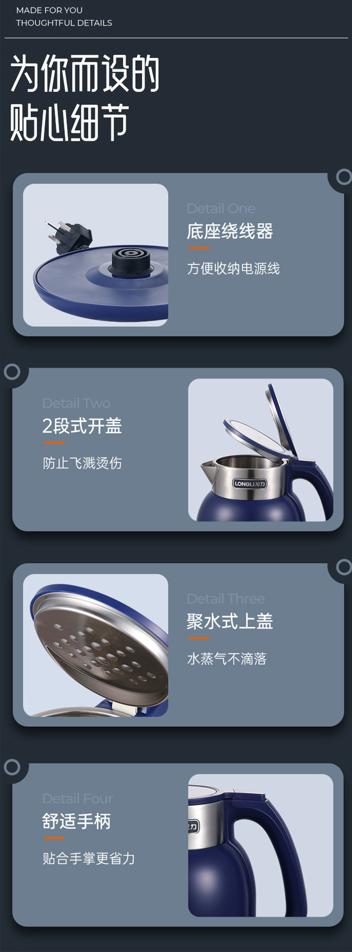除了(le)漏電防燙等問題,電源線過長也會導致日(rì)常生活中容易絆倒人。一旦電水壺在進行燒水工作,當(dāng)電線纏繞導致絆倒電水壺,裏麵的熱(rè)水便會傾倒,從而引發燙傷事故(gù)。如果家有反(fǎn)應緩慢的老人和愛活動的小孩,後顧將不堪設想。因此,電水壺(hú)電源線雖然設計成短長(zhǎng)度,卻飽含了設計師們(men)的用心良苦,當電水壺和插座靠(kào)得更近一些,安全程度也隨之大大提高,用戶使用也更(gèng)加(jiā)安心。