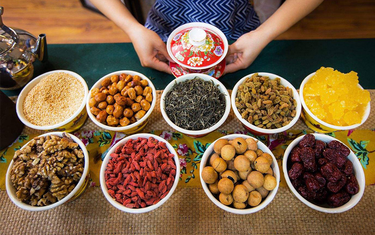 此時(shí)正值嚴冬時節,食補最重要的功效就是能夠暖(nuǎn)身(shēn)祛(qū)寒。除了臘八粥,暖心養生的“八寶茶”也能做到(dào)。八寶茶以茶(chá)葉為底,摻有白糖或冰糖,由八種茶料搭配而成。一般選擇茶葉、桂圓(yuán)、核桃、芝麻、枸杞、葡萄幹、紅棗、菊花等食材,材料並不是固定的,大家可以根據體質或個人喜好的(de)口感來選擇茶料搭配。八(bā)寶茶口感清甜,滋味獨具,有滋陰潤肺、清嗓利喉的功效,西北地區(qū)氣候幹旱,因此深受當地人的喜愛。